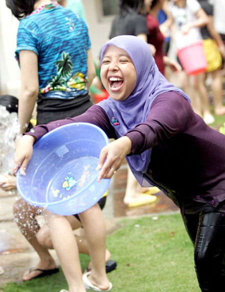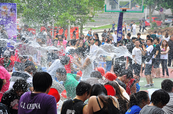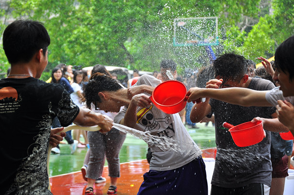 今日上午,华侨大学华丰楼前篮球场上歌声、笑声、呐喊声不绝于耳,来自缅甸、柬埔寨、老挝、泰国等国家和香港、澳门地区的500多名境内外学生互相泼水,互祝吉祥、幸福、健康,共同祈祷新年和平。