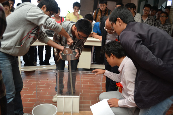 本次大赛的题目是纸质挡土墙结构设计,设计出的结构要能承受20公斤钢珠的重量,竞赛分为理论方案设计、结构模型制作、模型加载试验等环节。参赛学生用组委会统一提供的白卡纸和白胶,根据所学的力学等专业知识,经过不断的试验和计算设计出质量最轻、承受力最强的挡土墙模型。