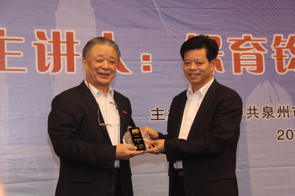 泉州市委常委、政法委书记许昆贞为保育钧颁发“华大讲堂”主讲嘉宾纪念牌