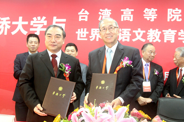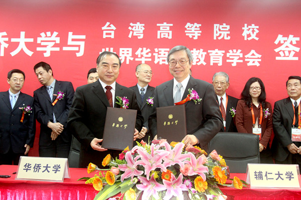 今日上午,在华侨大学厦门校区王源兴国际会议中心,华侨大学分别与世界华语文教育学会、义守大学和辅仁大学签署协议,合作开展华文教育工作。华侨大学校长贾益民、世界华语文教育学会理事长程万里、义守大学荣誉校长傅胜利、辅仁大学副校长周善行分别代表各方在协议书上签字。