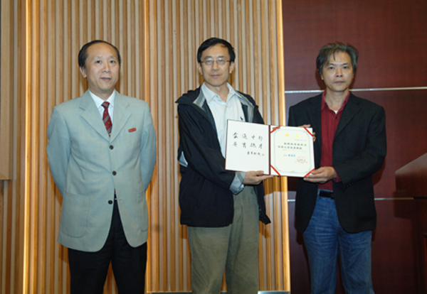数学科学学院院长黄心中(右一)、党总支书记林士明(左一)为钱涛教授颁发聘书