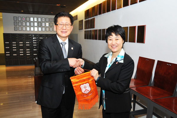 党委副书记朱琦环与香港理工大学酒店及旅游业管理学院院长田桂成互赠纪念品