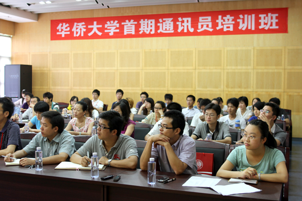 在王源兴国际会议中心G203和陈嘉庚纪念堂二楼会议室,百余名来自各部门、学院的通讯员,华大青年报、华侨大学广播台等校园媒体的学生记者参加了在此间举行的培训。培训班由党委宣传部副部长赵小波主持。
