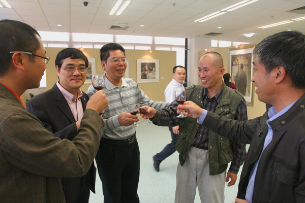 张禹东(左二)、刘塨(右)、刘斌(右三)与薛君宁(右二)在开幕酒会上
