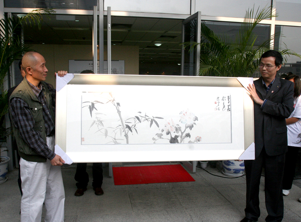 四端文物馆馆长许金顶(右)接受薛君宁赠画