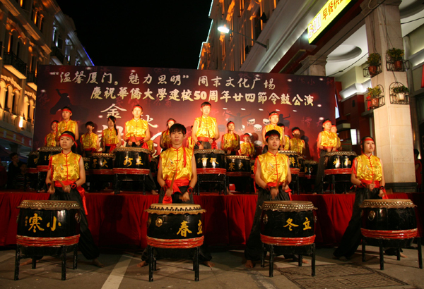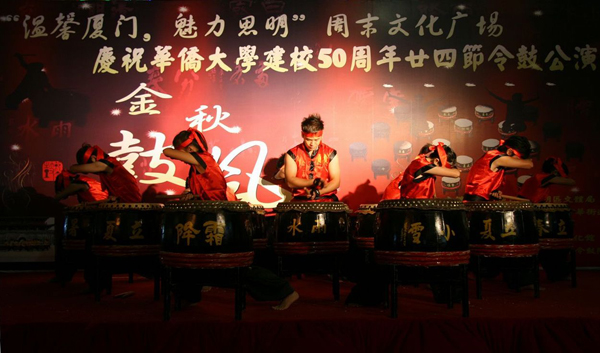 为进一步融入并丰富厦门文化生活,提升华侨大学在厦门市民心中的知名度和美誉度,学生处以庆祝建校五十周年为契机,积极整合当地社会资源,10 月 29 日晚在厦门中心商业区中山路步行街隆重举办“金秋鼓风——庆祝华侨大学建校 50 周年廿四节令鼓公演”。本次活动得到了厦门市思明区文体局、思明区中华街道、厦门市思明区文化馆的大力支持,并被纳入“温馨厦门·魅力思明周末文化广场系列活动之一”。华侨大学学生处处长陈国柱、厦门市思明区文化馆馆长王磊及厦门市思明区文化局、中华街道的嘉宾出席了当晚的活动。