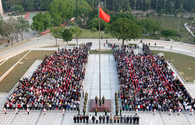 泉州校区升旗仪式现场,同学们摆出了“ 50 ”字型,纪念华侨大学走过的五十个不平凡的春秋。(图:张彬)