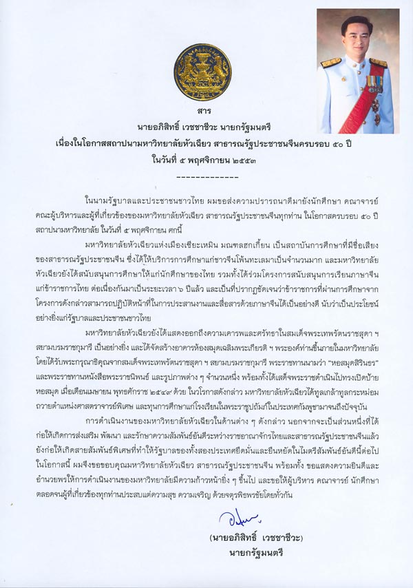 泰国总理阿披实日前为华侨大学五十周年校庆发来贺信,祝愿我校五十周年校庆取得圆满成功,祝愿全体师生员工幸福、安康。