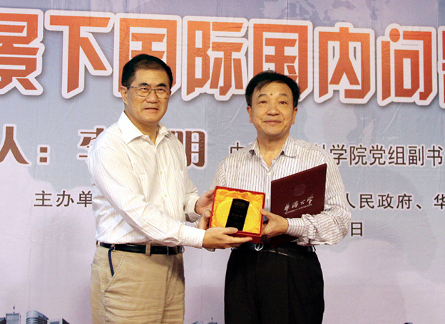 丘进校长为李慎明教授(右)颁授“华大讲堂”主讲嘉宾纪念牌