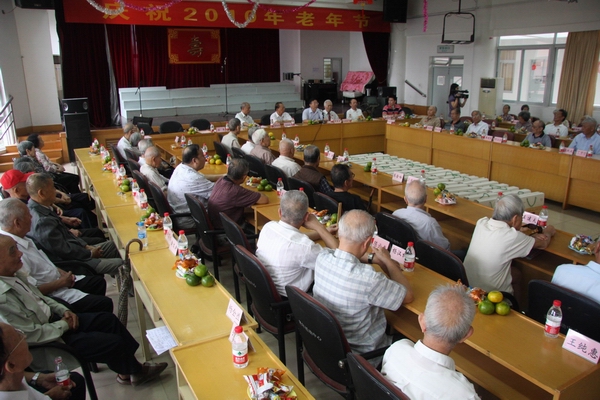 今天上午的老年活动中心三楼多功能厅充满着节日的喜庆,为庆祝重阳节的到来,我校为今年年满七十岁的老同志举行祝寿仪式,并分别为年满七十岁的老同志和八十岁以上的老寿星赠送纪念品和慰问金。