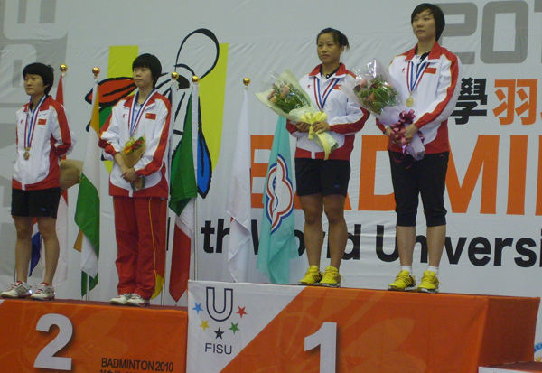 在女子单打比赛中,我校09级公共管理学院学生李雪芮和07级公共管理学院学生刘鑫包揽冠亚军。李雪芮和刘鑫分别在各自上下半区进行的淘汰赛中过关斩将,李雪芮在半决赛战胜中华台北队选手(世界排名第 11 )郑韶婕,率先进入决赛,下半区的刘鑫在半决赛中艰难地险胜日本选手sayaka sato(日本队第二号),与李雪芮会师决赛,最终李雪芮技高一筹,以 2 :0 战胜刘鑫。