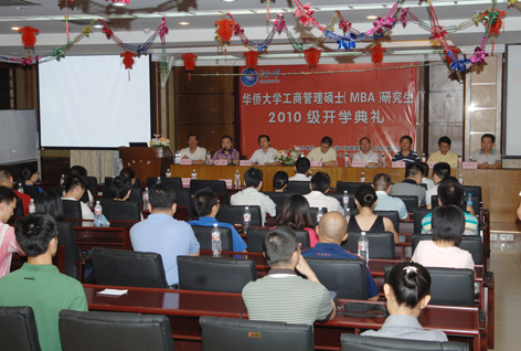 开学典礼在 MBA 学子为校庆五十周年创作的歌曲《华园相聚》中拉开帷幕。教师代表万文海老师在致辞中表示,作为 MBA 教师,需根据 MBA 学员的学科背景和职业背景充分准备教学内容,上好每一堂课,认真做好 MBA 学员的职业生涯规划。首届 MBA 联合会会长洪宏介绍了 MBA 联合会的发展历程,希望大家能在 MBA 中融合交流,创造自己辉煌的明天 , 达到“知行合一,力聚行远” 。新生代表路姗姗同学代表 2010 级 MBA 新生祝贺华侨大学 50 周年华诞,感谢华侨大学给他们提供一个再学习的教育平台,并立志在学习中长远规划,加强交流,把握今天,掌握明天,