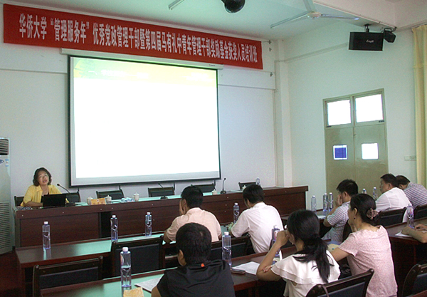 华侨大学“管理服务年”优秀党政管理干部暨第四届马有礼中青年管理干部奖励基金获奖人员培训班今日上午在老年活动中心五层多功能厅开班。校党委副书记、纪委书记朱琦环出席开班仪式,向在“管理服务年”中获评优秀管理干部的15位同志表示祝贺,希望大家珍惜此次学习机会,认真体会境内外学习考察内容,潜心思考,学有所获。