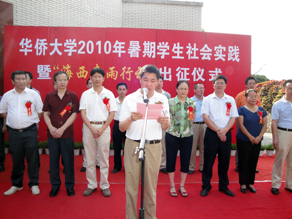 7 月 17 日上午,华侨大学 2010 年暑期学生社会实践暨“海西春雨行动”出征仪式在金川活动中心前广场举行。党委副书记、副校长关一凡,学工部、统战部、校团委、各学院分管学生工作负责人及各民主党派、无党派人士代表出席仪式,并为校级部分重点团队和“海西春雨行动”团队授旗。