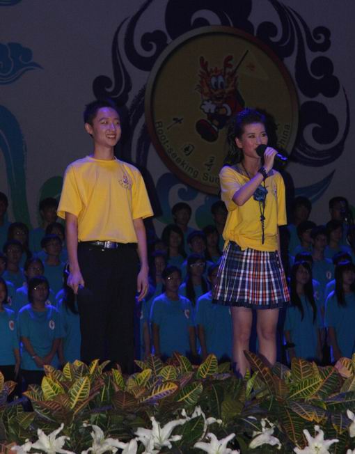 晚会由我校廿四节令鼓队开场,代表中国古节令的二十四面大鼓,为鼓手击打出或交错或划一的鼓点,厚重的鼓声与古朴的动作交相映衬,擂打出磅礴的气势,令在场观众为之惊叹。会上,来自不同国家的华裔青少年分别表演了富有各自居住国文化特色的节目,整台晚会掌声、喝彩声不断。我校音乐与舞蹈学院王一茜同学作为女主持人与美籍华裔学生马嘉阳共同主持整场晚会。