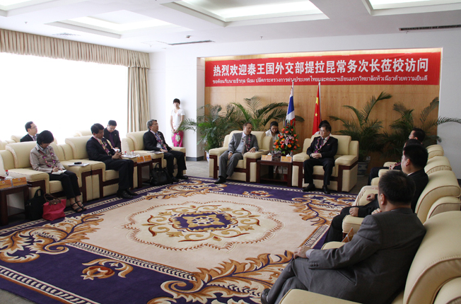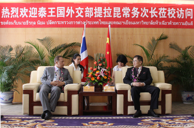 丘进代表校方热情欢迎提拉昆先生一行,诚邀泰国客人参加华大五十周年华诞庆典。还向来宾介绍华大的办学格局、发展规模、学科优势,及华大长期致力于推进与泰国各界的友好关系、不断加强双方在学术交流和教育合作等方面的进展等情况。丘进称,华大与泰国长期以来联系非常紧密。为了加强和推进双方在相关领域的交流与合作,华大在泰国开办了孔子学院,开设了中文硕士班,今年已有硕士毕业;还专门设立华大驻泰办事处,密切双方的联系;尤其是,在泰国政府高度重视和华大的不懈努力下,华大的华文学院已经成功举办五届泰国政府官员中文培训班,前五届学员已经圆满毕业,第六届学员又将入学;泰国诗琳通公主曾两次亲临华大;泰国驻厦总领事馆对双方的合作,也给予很多关心和帮助。这些更促进了双方友好关系的进一步发展。