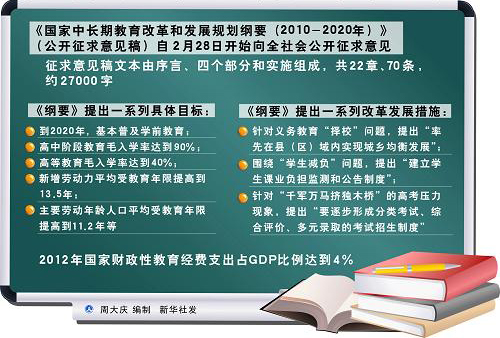 今年年初公开的《国家中长期教育改革和发展规划纲要(2010-2020年)》征求意见稿对中国各级各类教育的改革进行了规划,并提出未来10年的远景目标。如:到2020年,基本普及学前教育;高中阶段教育毛入学率达到90%;高等教育毛入学率达到40%。