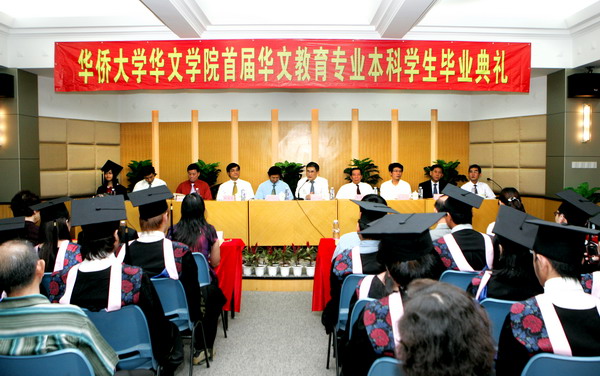 华侨大学校长丘进、副校长张禹东为毕业生代表颁发毕业证书。丘进校长在致辞中称,华侨大学的办学特点是面向海外华侨华人,首届华文教育专业本科学生毕业典礼,翻开了华侨大学历史新的篇章。他勉励学生回国后继续致力于华文教育事业,为传承中华文化,进一步拓展华文教育工作做出更大贡献。