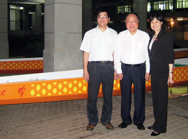 朱琦环(右)、张禹东(左)陪同黄天中校董(中)考察龙舟训练基地