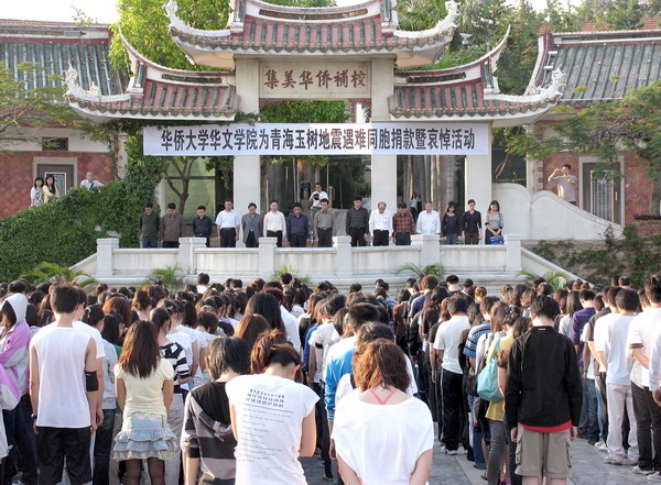 青海玉树地震灾情,连日来牵动着华文学院全体海内外师生的心。21日下午5时,华文学院在南门广场举行为青海玉树地震遇难同胞捐款暨哀悼活动。