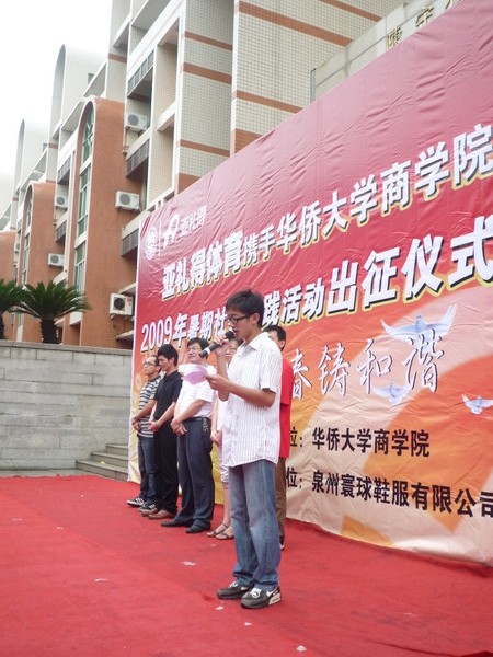 商学院党总支书记陈明森在仪式上致辞。他要求广大同学们要充分认识大学生参加暑期社会实践的意义;要进一步做好社会实践活动的工作安排。他希望同学们在社会实践中无私奉献、争当先锋,并强调了防暑降温、预防甲型 H1NI 流感等在社会实践活动过程中的一些注意事项。