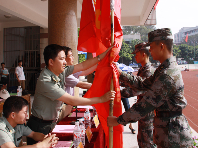 开幕式上,关一凡副校长向军训团团长授团旗,并与冯晓定副旅长共同向各连授连旗。