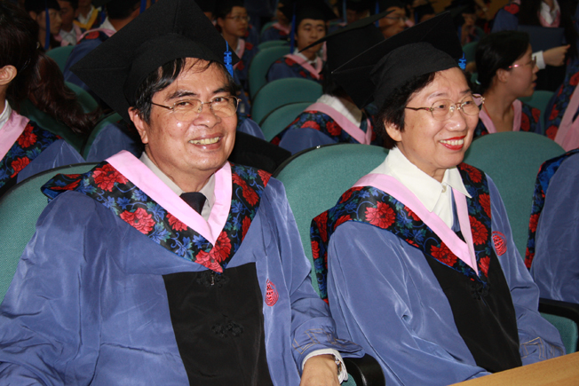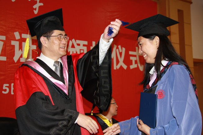 丘进为获得硕士学位的泰国中文硕士班毕业生拨置帽穗