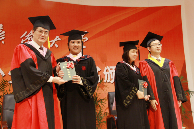 校长、博士生导师丘进(左),副校长、博士生导师徐西鹏(右)为获得学士学位的境外生颁发学位证书