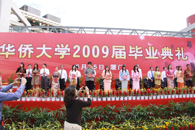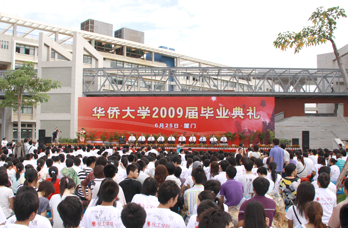 华侨大学厦门校区 2009 届毕业典礼昨日在综合教学楼群 B 、 C 区广场举行。这是厦门校区的第一届毕业典礼。据悉,厦门校区共有来自机电、土木、材料、化工、建筑、华文六个学院的毕业生 1455 人,获得学士学位 1166 人。