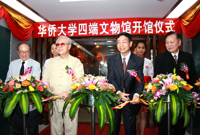 由华侨大学董事杜祖贻先生捐资兴建的四端文物馆 26 日开馆。杜祖贻先生与福建省侨办副主任沈能荣、华侨大学党委书记李冀闽、台湾中国文化大学教授欧豪年等共同为四端文物馆剪彩。