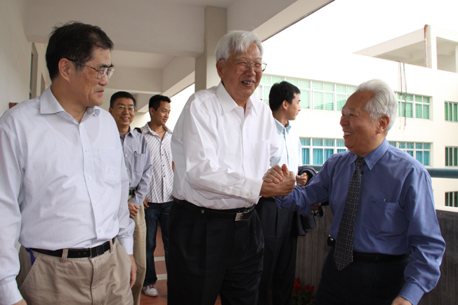 罗豪才(中)与华大老校长庄善裕(右)亲切握手