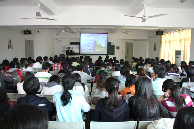 在陈守仁经济管理大楼 4-3 ,顾黎辉博士向华大师生详细介绍了美国加州的高等教育系统 、加州大学( UC )系统、加州大学洛杉矶分校的基本情况以及洛杉矶地区三所 UC 学校的暑期海外英语学习项目等,并解答了学生就赴海外学习的相关问题。