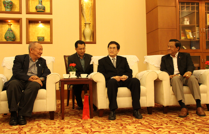 华侨大学校长丘进今日在厦门悦华酒店会见到访的泰国国防部御卫厅上将、诗琳通公主事务处秘书长瓦披龙将军和泰国泰中经济文化协会主席威七上将。