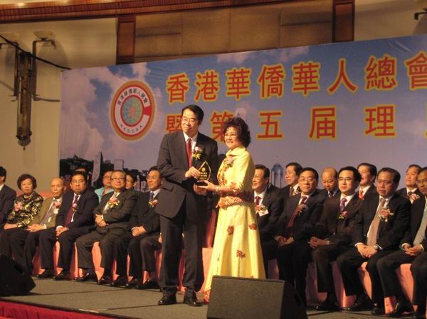 国侨办副主任许又声(左)向华侨大学校董、香港华侨华人总会监事长许碧葱赠送纪念品