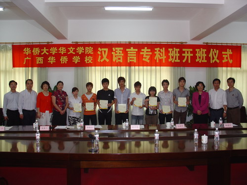 3 月 23 日 ,华侨大学华文学院与广西华侨学校联合举办的汉语言专科班开班仪式在广西华侨学校举行,广西壮族自治区侨办林荣蓉副主任、华文学院副院长李晓洁、广西华侨学校校长甘武军及 20 位汉语言专科班留学生出席了开学典礼。
