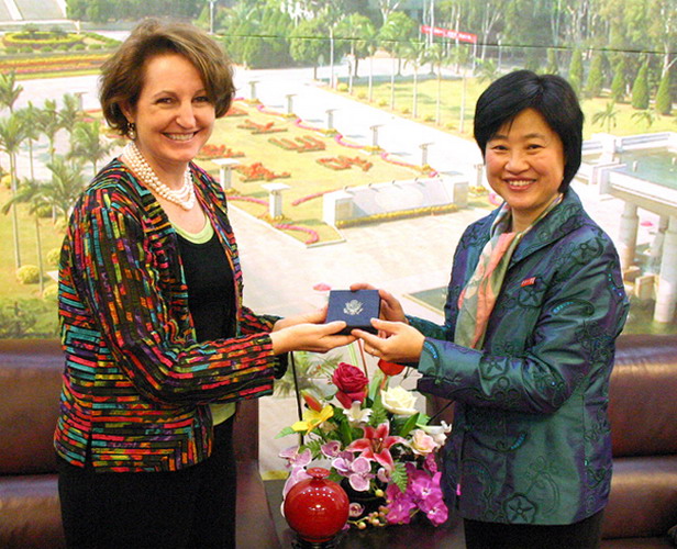 美国驻华大使馆一等秘书MaryKay Loss Carlson女士今天下午莅临我校,校领导朱琦环在陈嘉庚纪念堂接待室热情会见了来访的Carlson女士一行。 朱琦环欢迎和感谢Carlson女士到华侨大学演讲,并就中美两国的文化差异、教育制度等问题与Carlson女士进行交流。 在陈嘉庚纪念堂二楼会议室,Carlson女士以“中美外交关系30周年”为题,从中美关系的历史、当今的中美关系和中美关系迎接未来的挑战等方面发表了精彩演说。来自我校外语学院、商学院和人文学院的60多名师生参加了演讲会,并就自己感兴趣的话题与Carlson女士进行交流。