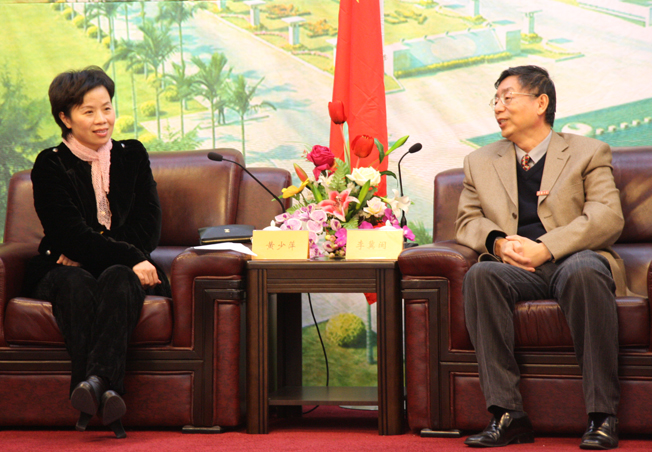图为华侨大学党委书记李冀闽与泉州市委副书记黄少萍亲切交谈(雷伟军/摄)