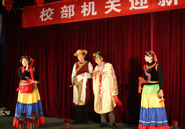 学生处、资产处、人事处、现代教育中心、校工会等十余个单位的工作人员在联欢会上表演了舞蹈、独唱、三句半、小合唱、配乐朗诵、小品和京剧等各具特色的文艺节目。