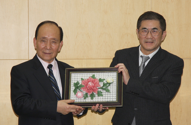 丘进校长与唐志坚团长互赠礼品。
