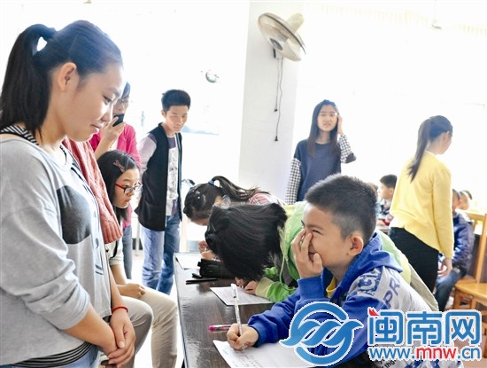 这里要举办的,是一场汉字书写大赛——泉州版《汉字英雄》,孩子们都是外来工子女,大学生都是来自华侨大学的学生志愿者。这也是丰泽区“周末第三课堂”从10月中旬起,在法花美社区试点推出一个月以来,又一场别开生面的周末活动,让孩子们过一把时下风靡的汉字书写瘾。