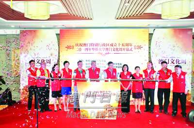 【暨大實習生李俊強廈門一日電】為慶祝澳門回歸祖國十五周年而設的華僑大學澳門文化周,今晚七時假廈門校區紫荆園開幕。華大副校長劉斌致詞,讚揚澳門校友會積極推動澳門經濟社會發展,為澳門繁榮作出貢獻。校友們更始終如一地關心母校,支持母校各項建設。