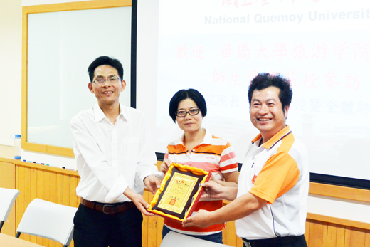 華僑大學旅遊學院MTA訪金門大學,由金大管理學院董燊院長接待,雙方並互贈紀念品。(金大提供)