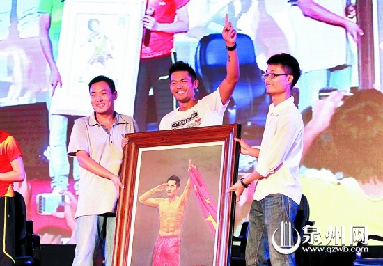 “伦敦奥运会羽毛球男子单打决赛,华大学子林丹2∶1逆转李宗伟夺金,成为奥运会该项目历史上首位成功卫冕的运动员;李雪芮首次参赛,便摘得女单桂冠;谌龙也是首次参加奥运会,夺得奥运会羽毛球男单铜牌,为国家赢得荣誉,为学校增光添彩……”华侨大学校长贾益民在致辞中盛赞林丹在伦敦奥运会的突出表现,并鼓励他再接再厉,再创佳绩。随后,华大向奥运健儿赠送纪念品,林丹也向学校赠送伦敦奥运会比赛战袍以及签名纪念球衣。