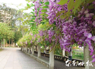 而如诗如画的紫藤是华大校内特有的风韵,四月紫藤花开,淡淡的紫色与石板路相映成趣,紫藤廊因此而得名,吸引了不少学生和游客驻足观赏,闲庭信步。