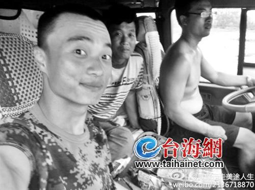 图片说明:每次搭上好心人的车,张福庭(左一)总要留个这样的纪念
