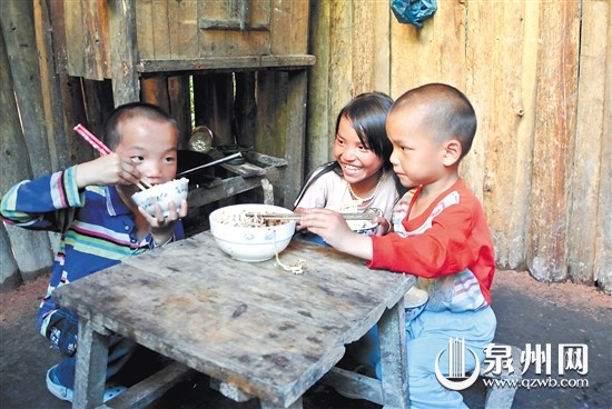 弄团小学生龙光林、龙光美的晚饭。虽然每天的菜都只是一碗面条,但是他们吃得特别的香