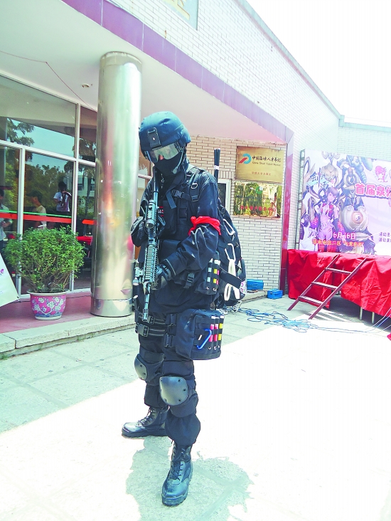 来自德化陶瓷学院的小雷当天得到了很多的关注。因为大家担心他热坏了。泉州当天最高气温31℃,他却全副武装:盖住耳朵的帽子、毛线做的口罩、皮质黑色手套……把自己打扮成游戏《生化危机》中安布雷拉的佣兵,只留两个鼻孔出气。他告诉记者,这套装扮共花去了500元左右。