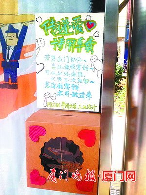 昨天上午9点左右,岛内的12个公交站点多了一个零钱盒子,挂在公交站牌上,里面塞了10个硬币,准备给急着上公交车,却又找不到零钱的人。出这主意的,是华侨大学2014级工业设计专业的山东小伙田馥铭。作为“学雷锋月”的一个活动,他和班上十几名同学,想作一个尝试。