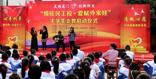 中国侨网4月3日电 据中国华文教育网消息,近日,“情驻民工校•爱赋外来娃”大学生支教暨来厦务工人员子女慰问活动启动仪式在福建厦门市湖里区霞光小学隆重举行,包括华侨大学华文学院志愿支教服务队在内的5支队伍将分别奔赴湖里区的5所民工子弟小学开展支教服务。