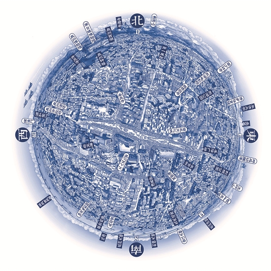这组手绘图名为《泉州鸟瞰图》,共9张。整组图画面主色调呈蓝色。第一张为主图,圆形,貌似相机鱼眼镜头从遥远的高空拍摄,将整个泉州城区囊括其中。在高低错落、鳞次栉比的建筑物间,城市主干道、标志性建筑等一一呈现。作者解释,“为画这张图,当时把鱼眼镜头还挂在遥控飞机上勘景,一度后背发凉,真惊险。”